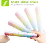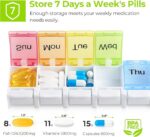 - Spring-Assisted One-Handed Opening: This weekly pill organizer features rubber-strip-assisted lids that spring open easily. Vividly colored, date-marked lids make doses clear at a glance. Each compartment holds up to 8 fish oils or 11 large vitamins. Overall size: 8.83″×2.1″×1.03″; compartment size: 1.3″×1.18″×0.82″