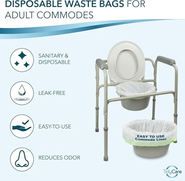 • 100% Leak Free: No leaking, guaranteed. TidyCare disposable commode bags keep everything tidy, sanitary, and hygienic while also saving time for care givers, the elderly and the bariatric. The commode disposable liners eliminate the need for cleaning or rinsing the commode bucket.