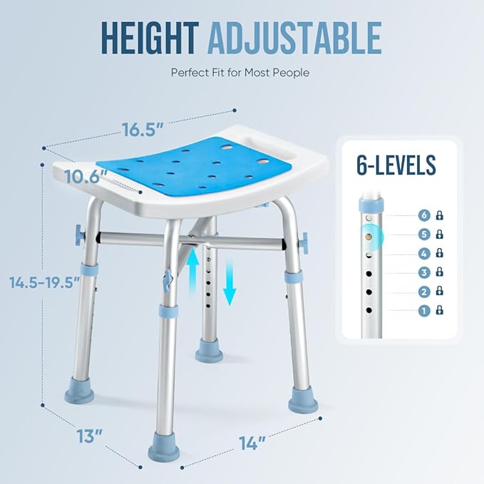 - Perfect Size for Smaller Showers: Durably constructed, shower transfer bench stool is lightweight and safe to use. Great support for those with chronic fatigue or balance issues, the stool is also useful following injury or surgery. Fits almost anywhere in bathroom; With a range of 14.5″-19.5″ height and 13″ X 14″perfect size for smaller bath.