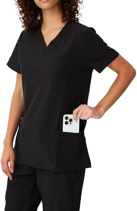 - V-Neck Scrubs Top with 5 Pockets: Features 1 chest pocket, 3 front patch pockets and a pen slot in the left pocket for easy access. Side slits enhance mobility, combining comfort and functionality, making it ideal for professionals